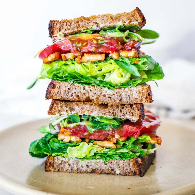 This delicious BLT sandwich features smoky tempeh bacon, juicy ripe summer tomatoes, crisp lettuce, and toasted sourdough bread. A healthy plant-based twist on the classic that’s perfect for lunch or a light dinner!