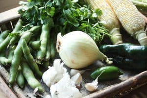 The onions, garlic, fava beans, peppers and corn were sauteed until tender. Once seasoned, toss in a little chopped cilantro and squeeze of citrus right before serving.