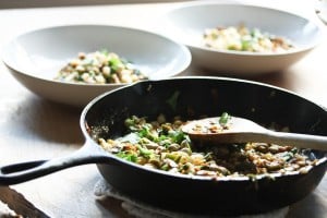 Now I have to admit, for this recipe, I did not remove the second skin. This is up to you. To soften the skin a bit, I sautéd them for a few minutes with the onion and garlic and added a generous splash of veggie stock and simmered on low for 7 minutes. Then I added the rest of the ingredients. They are toothsome, but I don’t mind this.