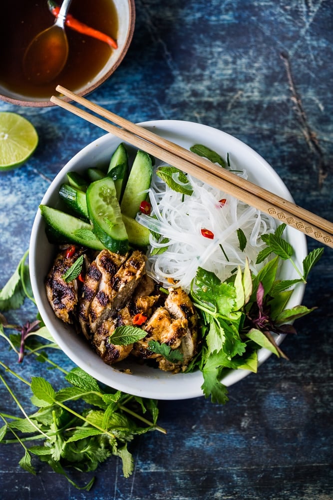 While the lemongrass chicken is grilling, cook the rice noodles, make the nuoc cham dressing and cut up some crunchy veggies like cucumber and radish. Serve with fresh mint and Thai Basil for the best flavor.